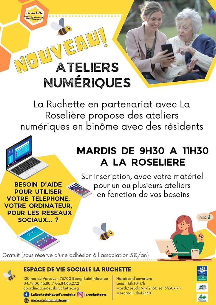 Nouveau !!! Des ateliers numériques sont proposés à la Roselière en binôme avec les résidents de la Roselière. Appeler nous pour réservez votre créneau. Ces ateliers sont accessibles sur inscription auprès de la Ruchette