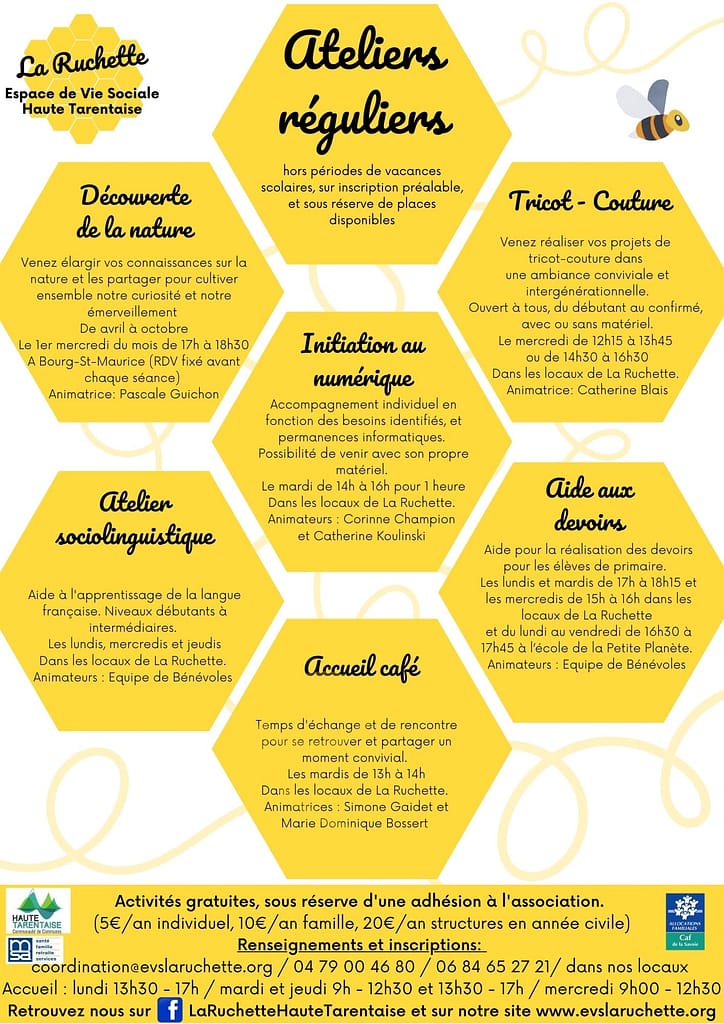 - Numérique : Accompagnement individuel en fonction des besoins identifiés, et permanences informatiques. Il est conseillé de venir avec son propre matériel. Atelier animé par Corinne ou Catherine, les mardis de 14h à 16h par créneau d’une heure, à la Ruchette. Sur inscription.