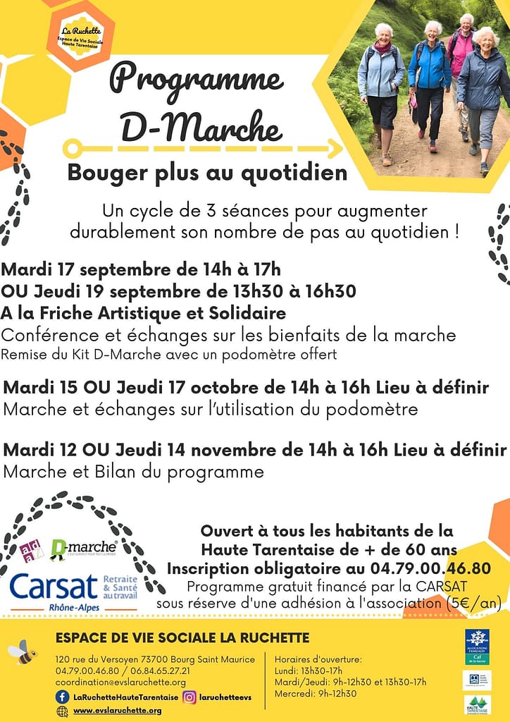 Venez vous remettre en mouvement avec Marie-Claire MEREL autour du programme D-Marche. Ce sont trois séances qui permettent de reprendre l’habitude de bouger plus au quotidien.
